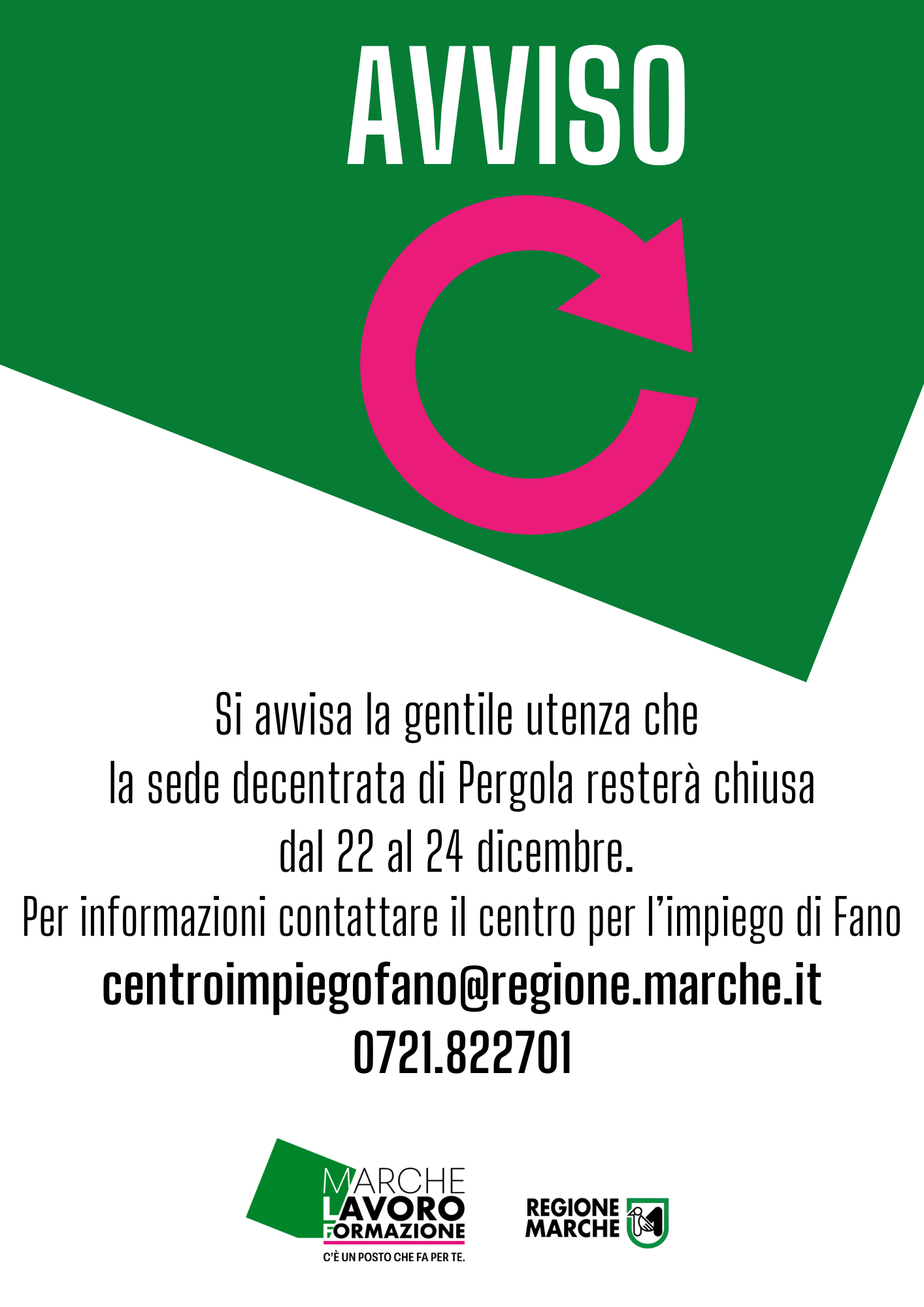 venerdì 19 dicembre 2025 02:00 SEDE DECENTRATA LAVORO DI PERGOLA COMUNICA: CHIUSURA UFFICIO DAL 22 al 24 dicembre