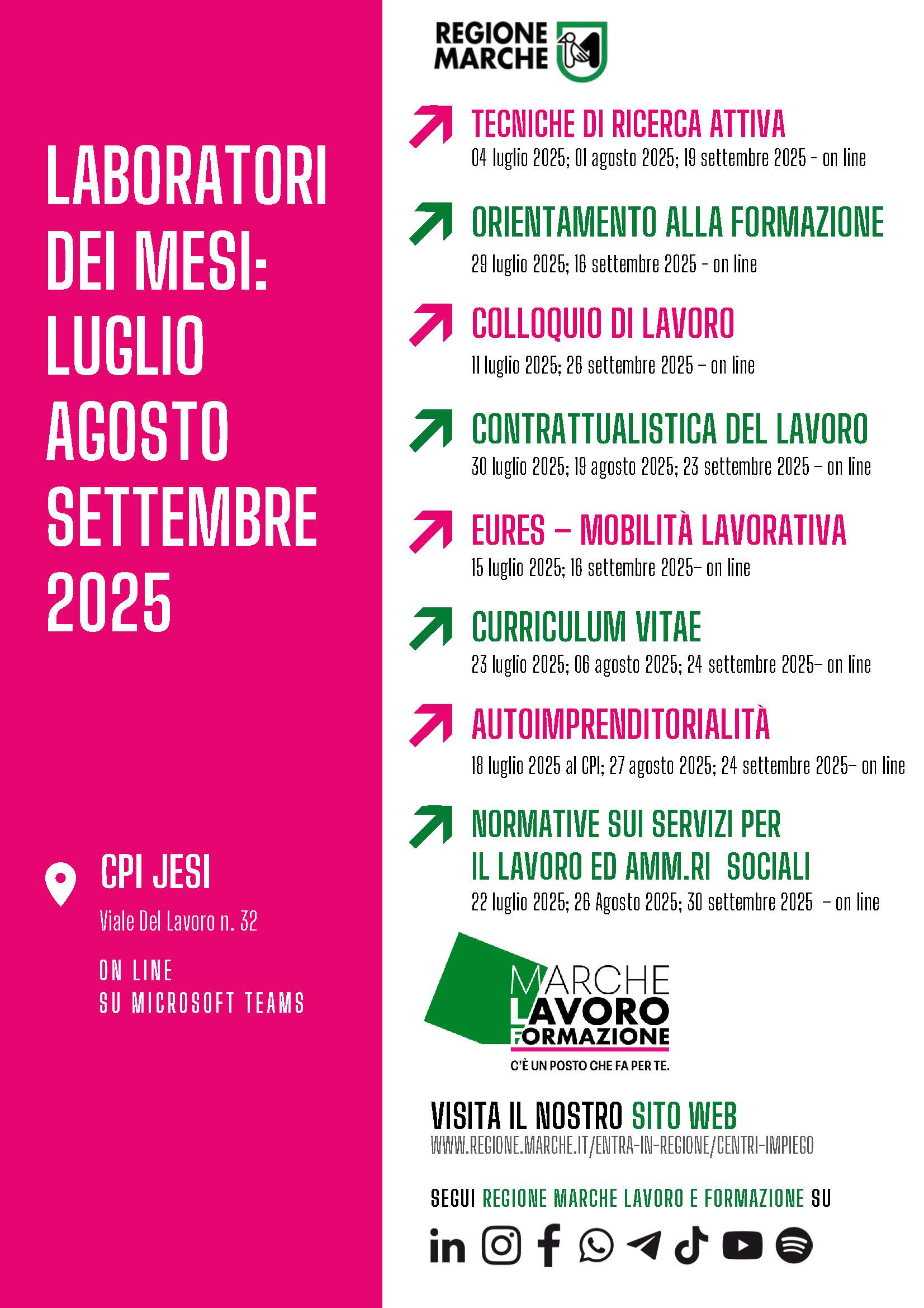lunedì 4 agosto 2025 11:49 LABORATORI ESTIVI “Il Centro per l'Impiego di Jesi propone per l’ESTATE 2025 un’ampia offerta di LABORATORI DI ACCOMPAGNAMENTO AL LAVORO E POLITICA ATTIVA, intesi a supportare la persona nel percorso di inserimento o reinserimento nel mercato del lavoro. I Webinar sono realizzati on line mediante piattaforma gratuita Microsoft Teams. Per partecipare è sufficiente prenotarsi inviando una e.mail a centroimpiegojesi@regione.marche.it indicando il laboratorio prescelto ed i propri dati anagrafici. Per informazioni di dettaglio su ciascun laboratorio si rinvia alla locandina in allegato”. --> LOCANDINA