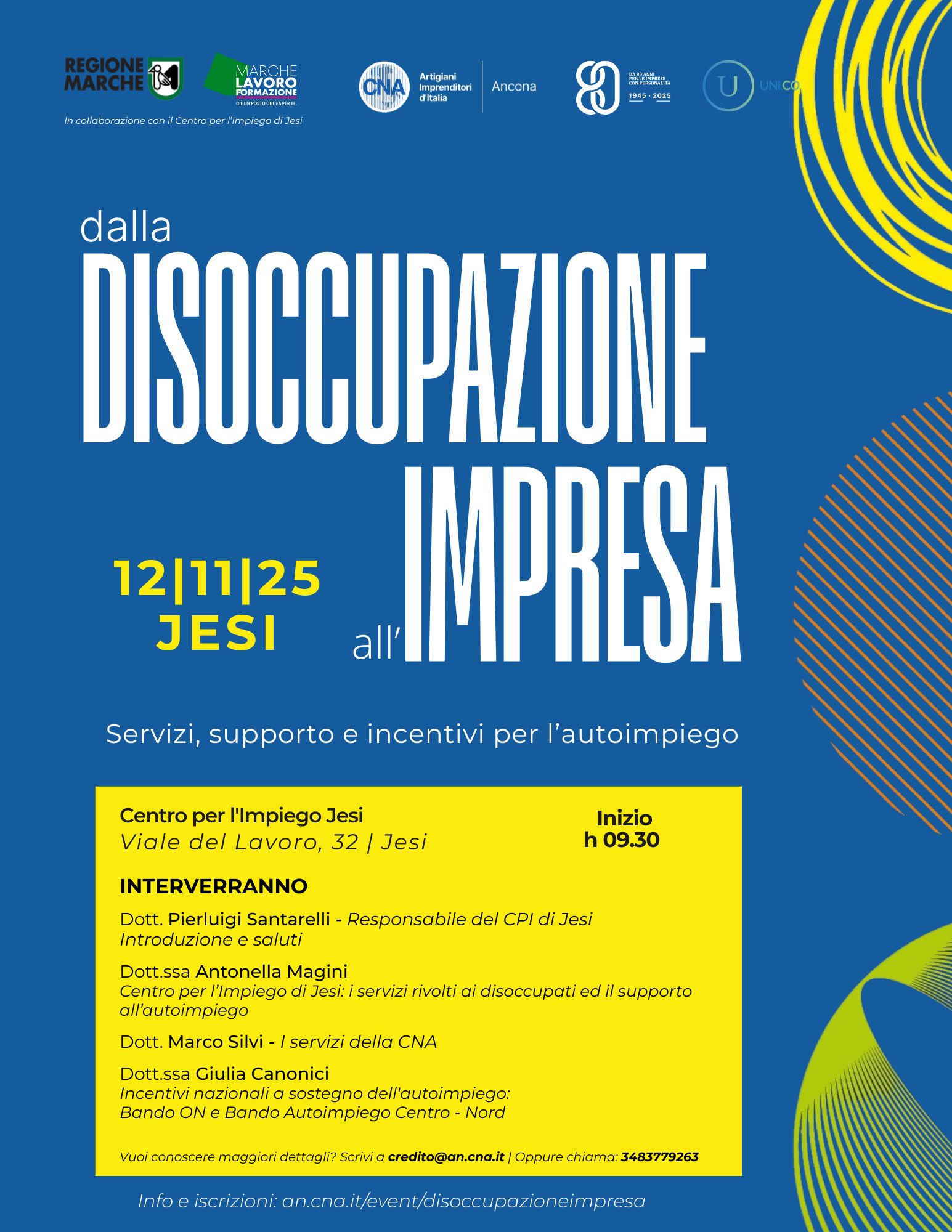 giovedì 6 novembre 2025 02:33 DALLA DISOCCUPAZIONE ALL'IMPRESA Il CENTRO PER L’IMPIEGO DI JESI, in collaborazione con CNA ANCONA, organizza il giorno 12/11/2025, alle ore 9:30 un incontro-evento sul tema “DALLA DISOCCUPAZIONE ALL’IMPRESA: SERVIZI, SUPPORTO ED INCENTIVI PER L’AUTOIMPIEGO”, che si terrà presso la Sala Conferenze del CPI di Jesi. Per prenotazioni invia una mail a centroimpiegojesi@regione.marche.it entro il giorno antecedente la data prefissata, indicando i dati anagrafici. --> LOCANDINA