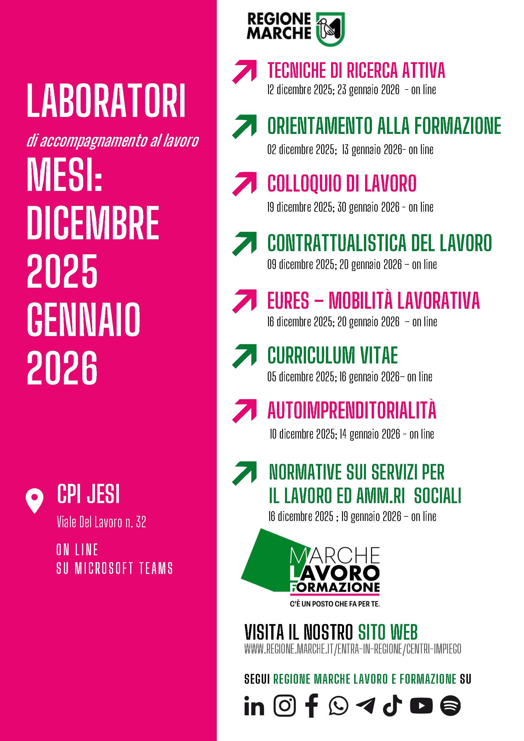 giovedì 8 gennaio 2026 09:17 CPI DI JESI – LABORATORI DI ACCOMPAGNAMENTO AL LAVORO – DICEMBRE 2025 - GENNAIO 2026 “Il Centro per l'Impiego di Jesi propone per i mesi di DICEMBRE 2025 e GENNAIO 2026 un’ampia offerta di LABORATORI DI ACCOMPAGNAMENTO AL LAVORO E POLITICA ATTIVA, intesi a supportare la persona nel percorso di inserimento o reinserimento nel mercato del lavoro. I Webinar sono realizzati on line mediante piattaforma gratuita Microsoft Teams. Per partecipare è sufficiente prenotarsi inviando una e.mail a centroimpiegojesi@regione.marche.it indicando il laboratorio prescelto ed i propri dati anagrafici. Per informazioni di dettaglio su ciascun laboratorio si rinvia alla locandina in allegato”. --> LOCANDINA