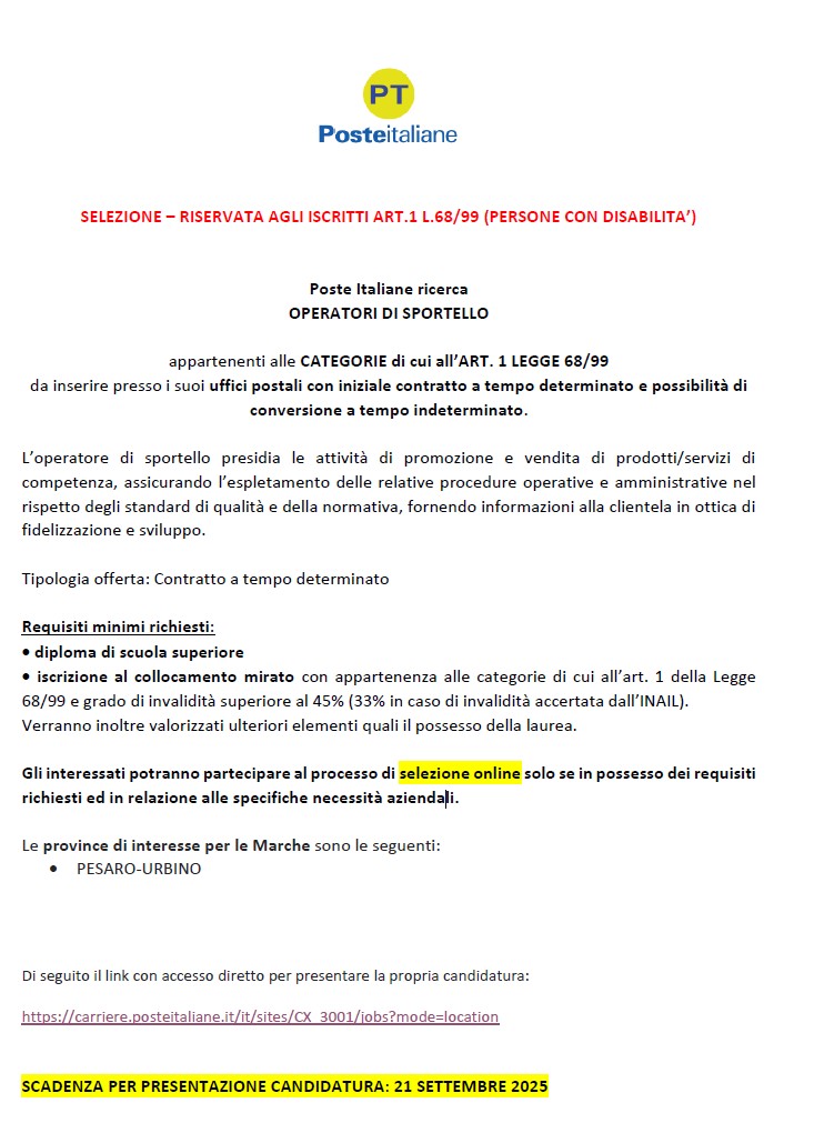 martedì 16 settembre 2025 02:33 SELEZIONE – RISERVATA AGLI ISCRITTI ART.1 L.68/99 (PERSONE CON DISABILITA’) Pesaro 0 views 0 comments Go Back Tags: