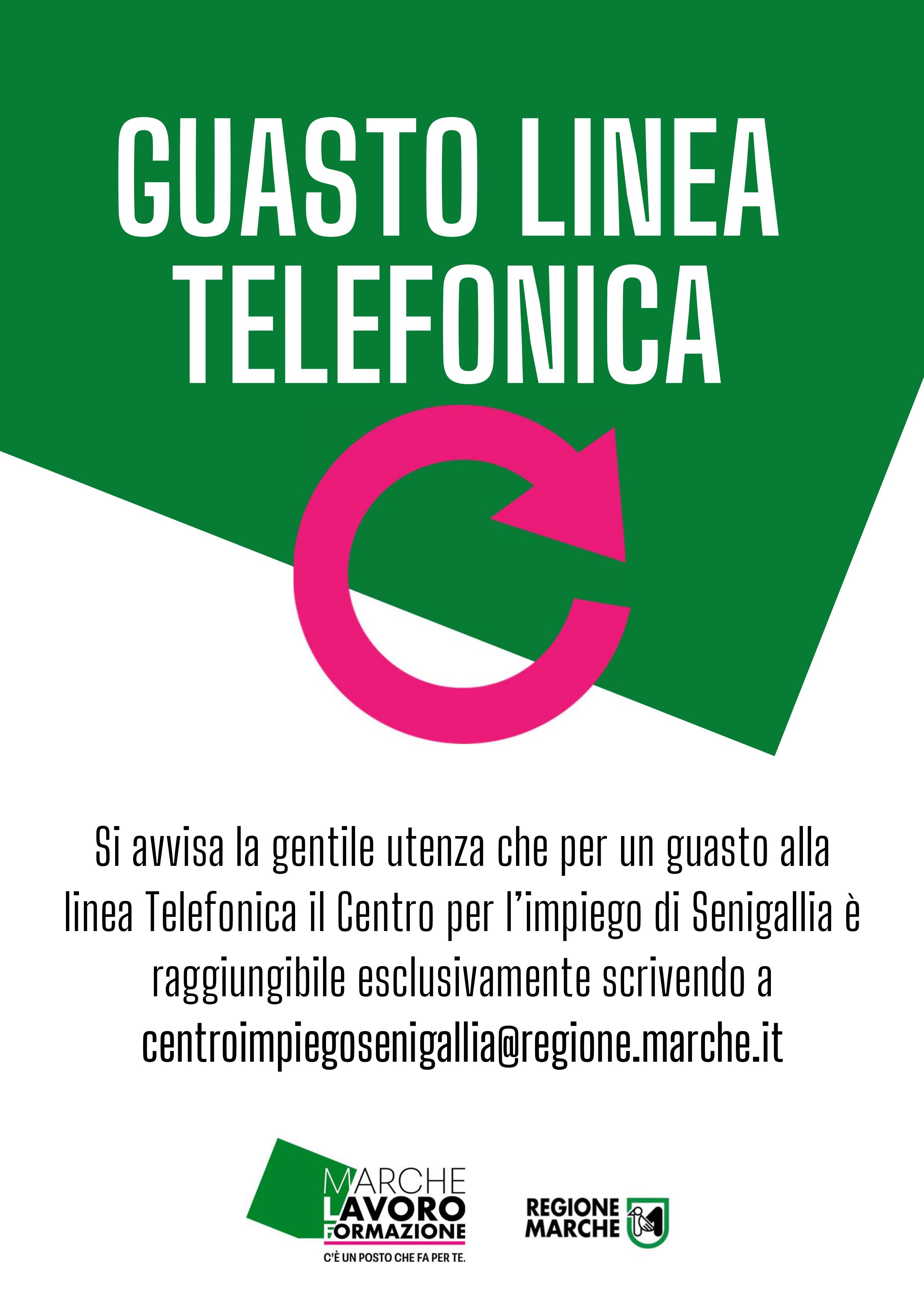 mercoledì 14 gennaio 2026 09:11 Avviso all'utenza: GUASTO LINEA TELEFONICA Senigallia 0 views 0 comments Go Back Si avvisa la gentile utenza che per un guasto alla linea Telefonica il Centro per l’impiego di Senigallia è raggiungibile esclusivamente scrivendo a centroimpiegosenigallia@regione.marche.it Tags: