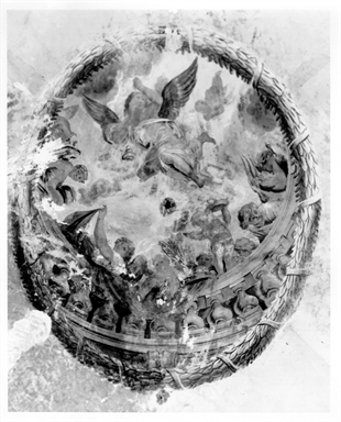 Non vi è dubbio che questo grande oculo sia stato dipinto da Tommaso Nardini insieme alla restante decorazione pittorica della volta della chiesa. Alla felice resa illusionistica di impronta barocca si accompagna una stesura pittorica assai libera ed elegante che manifesta l'inclinazione dell'autore verso uno stile di derivazione rococò legato all'ambiente romano.