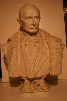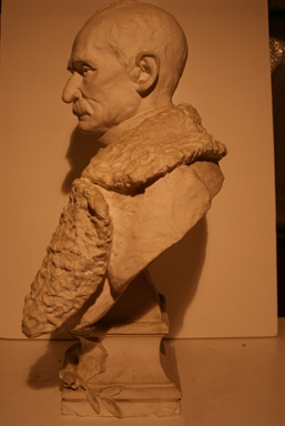 Busto in gesso su piedistallo a base rettangolare modanato e decorato con tralci di alloro e stemmi.