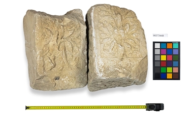 Segnacolo funerario fortemente danneggiato in due frammenti con decorazione fitoforme verticale.