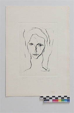 La stampa rappresenta un volto ripreso frontalmente, sorretto da un lungo collo. Si identifica la mano dell'artista caratterizzata da un segno leggero e sintetico.
