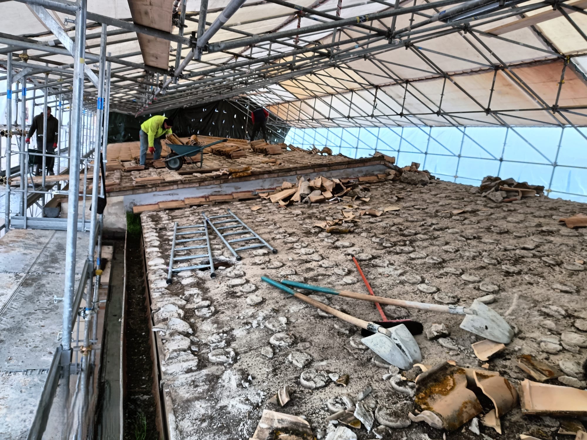 Il teatro, gravemente danneggiato dal sisma, è oggetto di un intervento che coinvolge l’intero edificio, dalle fondamenta fino alla copertura, con operazioni di consolidamento strutturale, messa in sicurezza e risanamento che stanno trasformando la struttura giorno dopo giorno.