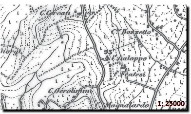 La prima Carta Topografica d'Italia è stata redatta dall'IGMI tra il 1892-1895. Il territorio è stato rappresentato in quadranti alla scala 1:50.000 ed in tavolette alla scala 1:25.000 (rappresentata nella figura a lato).