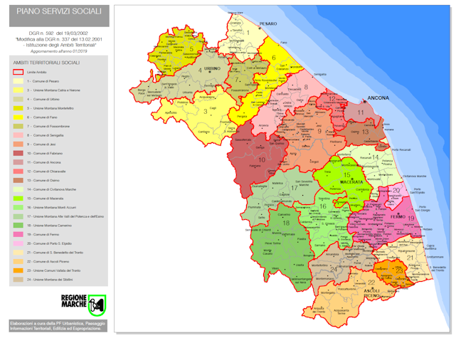 Su base cartografica contenente i confini amministrativi della Regione Marche (Comuni e Province), sono presentati, con colori diversi, gli Ambiti Territoriali Sociali definiti dal Piano dei Servizi Sociali (DGR n. 592 del 19/03/2002 “Modifica alla DGR n. 337/2001 – Istituzione degli Ambiti Territoriali”). La cartografia (aggiornamento alla D.G.R. n. 1649 del 26/11/2012) è realizzata in formato A3.