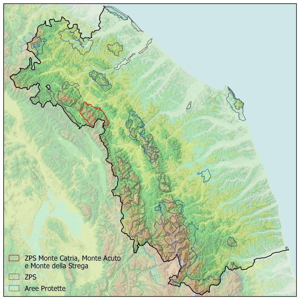 La Zona di Protezione speciale “Monte Catria, Monte Acuto e Monte della Strega” si estende per un’area di 8.844 ha, in provincia di Pesaro e Urbino e, in misura minore in quella di Ancona; comprende, in parte, la ZSC IT5310019 “Monte Catria – Monte Acuto”.